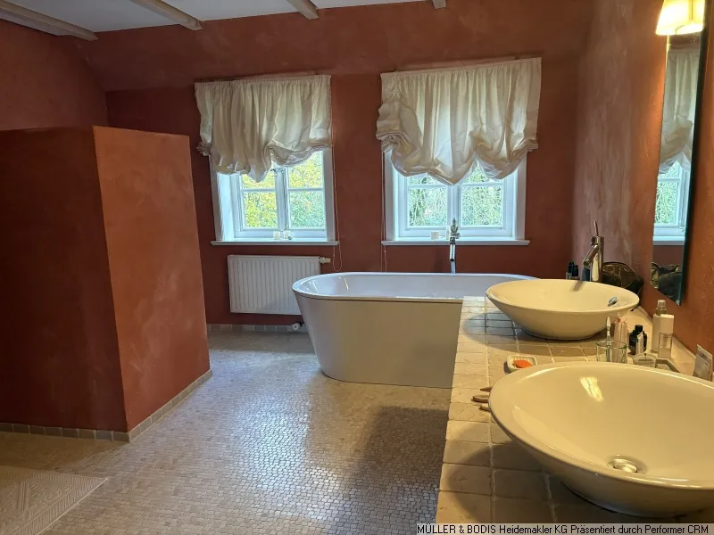Alle Bäder im Haus (Gäste-WC im EG, Kinder-/Gästebad und Elternbad im OG) wurden großzügig gestaltet und einheitlich mit weißen Objekten ausgestattet. Besonders schön ist die große freistehende Badewanne im OG.