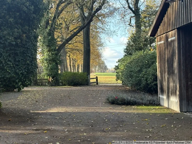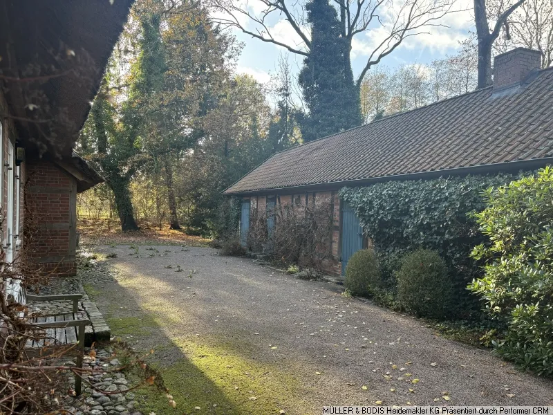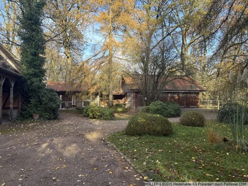 An die sanierte Scheune, die aktuell drei große Pferdeboxen (Röwer & Rub) und einen großen Putzplatz beinhaltet, grenzt im vorderen Bereich das neue Doppelcarport an. Direkt an die Scheune schließen sich zwei Außenboxen an. Die dann angrenzende große hölzerne Garage bietet Platz für drei große PKW.