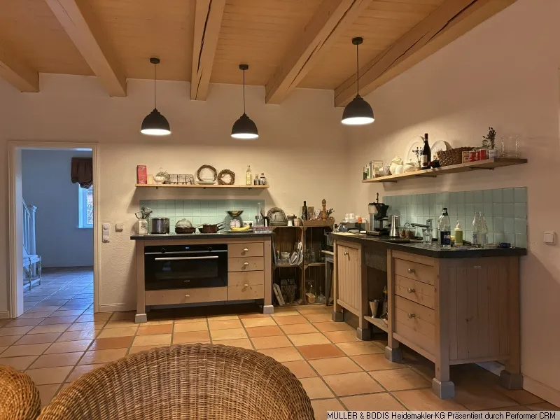 Die Küche ist offen in den Wohn-/Essbereich integriert und verfügt über einen großen Herd mit Ceranfeld, einen Backofen, einen Geschirrspüler und eine Kühl-Gefrierkombination. Hier wurde ein edlesTerrazzo-Spülbecken eingebaut.