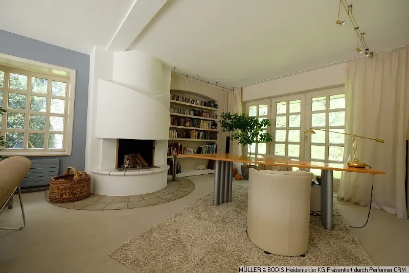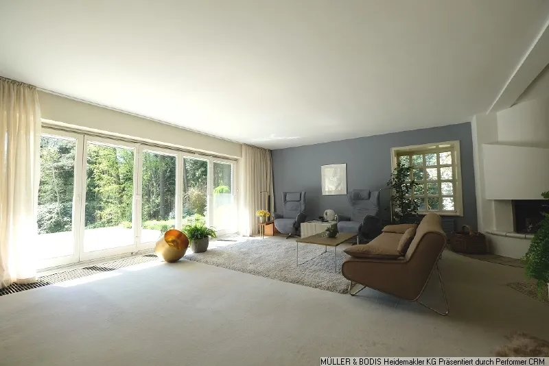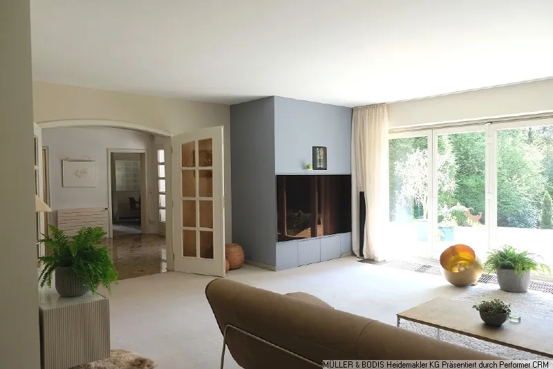 Von der geräumigen Diele gelangt man durch eine doppelflügelige Tür in das große Wohnzimmer, das durch die breite und bodentiefe Fensterfront den Blick in den eindrucksvollen, gepflegten Garten und den an der Terrasse liegenden Teich freigibt. Blickfang ist hier auch ein großer halbrunder Kamin, der das Wohnzimmer in zwei Bereiche aufteilt. Weiße Kassettentüren und ein heller Teppichboden runden den Gesamteindruck sehr stimmig ab.