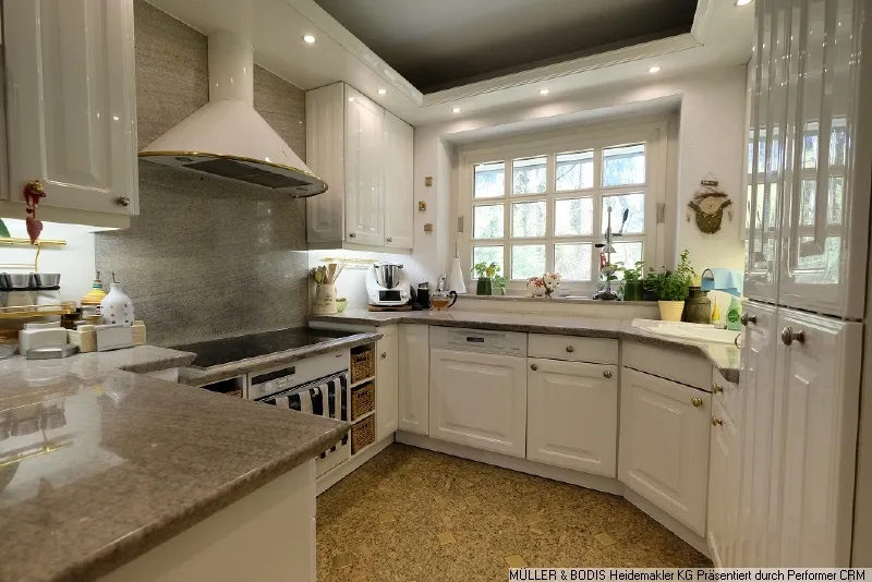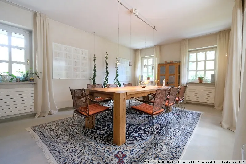Eine hochwertige Siematic-Einbauküche mit hochglänzenden Fronten in weiß und allen technischen Geräten lädt zum Kochen ein. Sie finden hier eine Küche mit vielen Extras, wie beispielsweise ein Kühlschrank mit Crushed-Ice-Funktion, vor. Die Küche ist durch einen kleinen praktischen Abstellraum von der Doppel-Garage getrennt. An die Küche schließt sich das Esszimmer mit direktem Zugang zur Terrasse an.