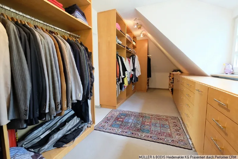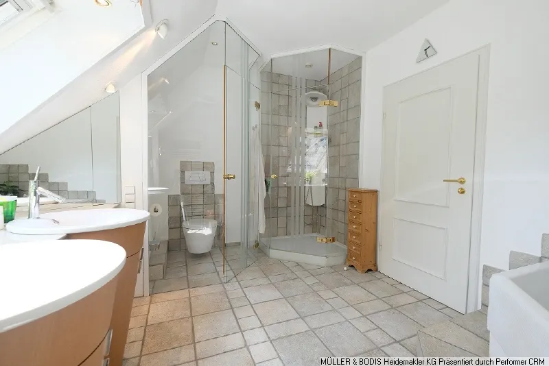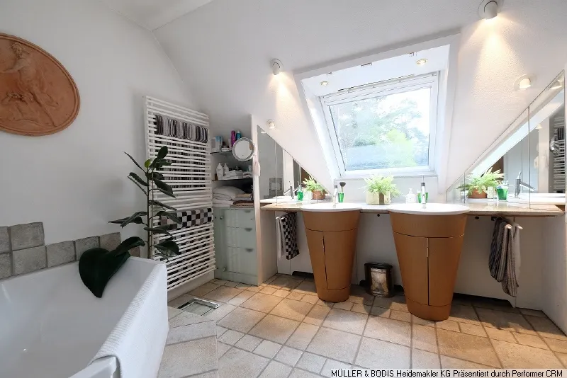 Das Obergeschoss des Hauses wird über eine geschwungene weiße Holztreppe erreicht. Hier befinden sich ein Master-Schlafzimmer mit einem angrenzenden begehbaren Kleiderschrank, der jedes Frauenherz höher schlagen lässt und der Platz für viel Garderobe bietet und dank der Fenster schön hell ist. Das große Badezimmer erhält durch ein Veluxfenster ausreichend Tageslicht und verfügt über zwei moderne Säulenwaschtische, eine Eckbadewanne sowie eine Eckdusche mit eigener Beleuchtung und ein seperiertes WC. Als Fliesenbelag wurden hier geschmackvolle beigefarbene Fliesen verarbeitet.
