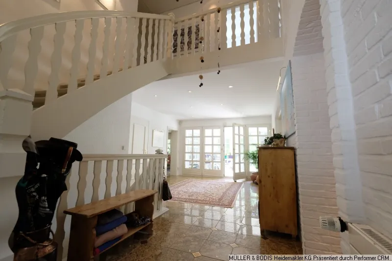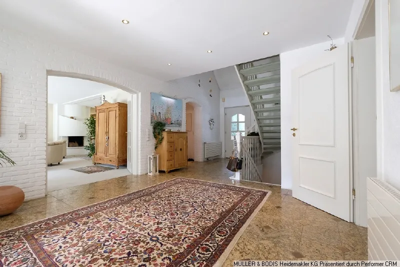Das Erdgeschoss wurde in der geräumigen Diele mit Empore, in der Küche, dem Gäste-WC und der Garderobe geschliffene Granitplatten mit Messingeinlagen verlegt - ein außergewöhnlich schöner und interessanter Bodenbelag.