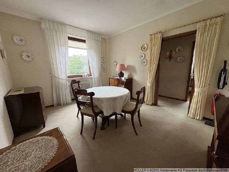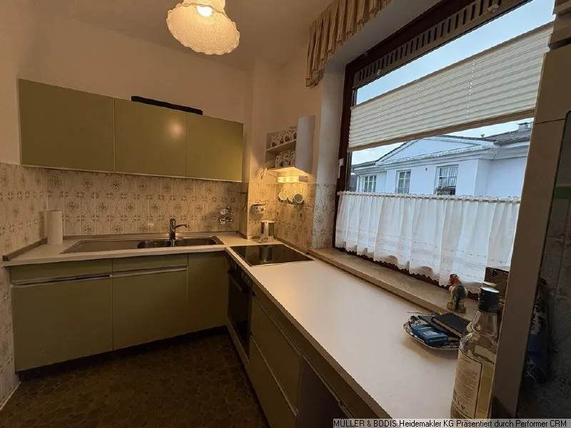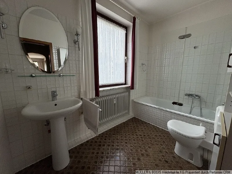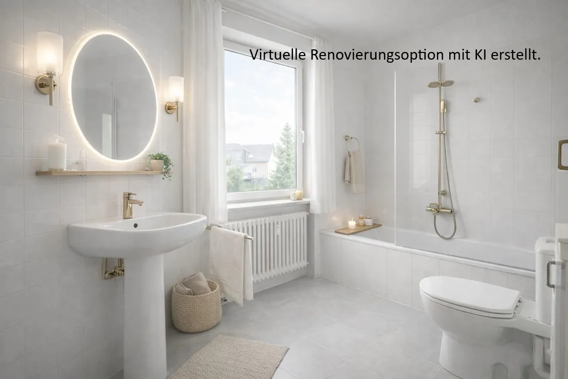 Das große Wohnzimmer mit seinen ca. 25 m² verfügt über eine große Fensterfront und eine doppelflügelige Terrassentür. Die Einbauküche ist sehr gepflegt, stilistisch aber nicht mehr dem Zeitgeist entsprechend. Das geräumige, befensterte Vollbad ist mit weißen Relief-Fliesen an den Wänden gekachelt und mit weißen Objekten ausgestattet (Waschbecken, WC und Badewanne).