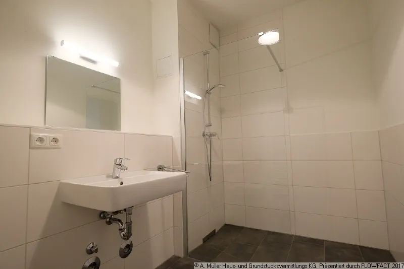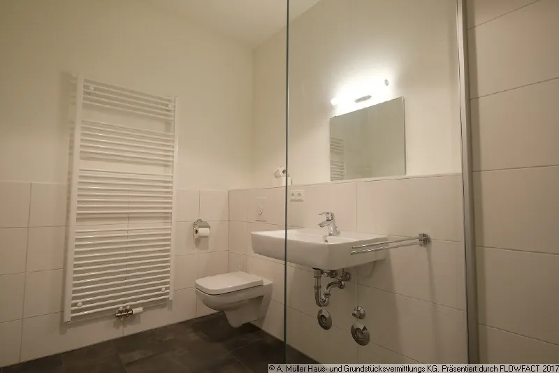 Das Badezimmer der Wohnung ist mit einem WC, einem Handwaschbecken, einem Handtuchheizkörper sowie einer ebenerdigen Dusche mit einer hochwertigen Glastrennwand ausgestattet. Die Objekte sind modern in weiß gehalten, die Bodenfliese ist anthrazitgrau.