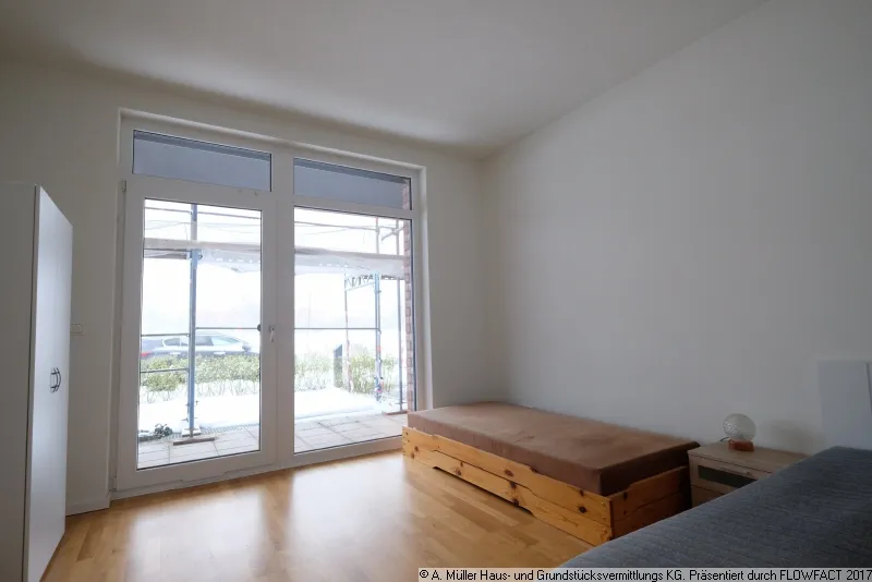 Angrenzend an den Wohnraum befindet sich das Schlafzimmer mit ca. 15,86 m². Alle Wohnräume der Wohnung sind durchgängig mit einem Echtholzparkettfußboden, unter dem sich eine moderne Fußbodenheizung befindet, ausgestattet. Die Räume verfügen jeweils über eigene Regelungen an den Wänden.