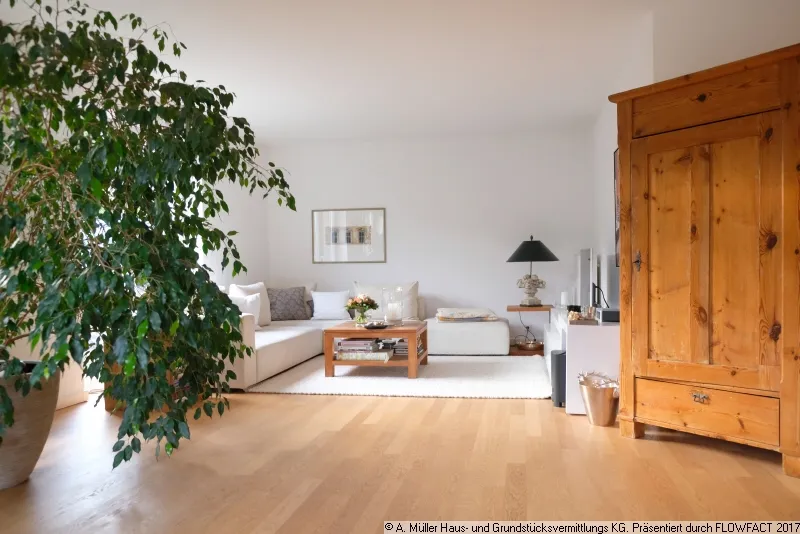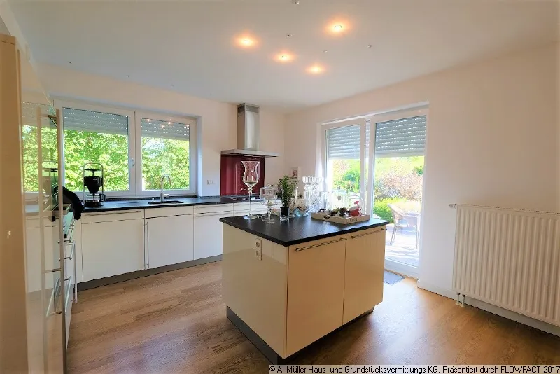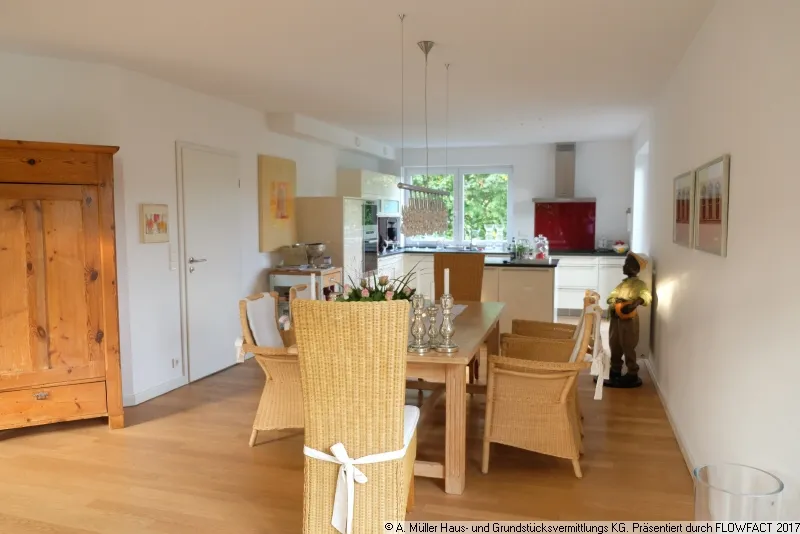 Der großzügige Wohn-/Essbereich mit der offenen Küche ist mit einem hellen eichenen Parkettfussboden ausgelegt. Hier besticht der Blick durch die bodentiefen Fenster und Fenstertüren in den zauberhaften Garten und auf die teils überdachte Terrasse gen Süden.