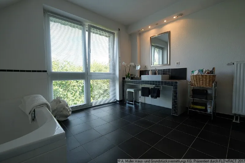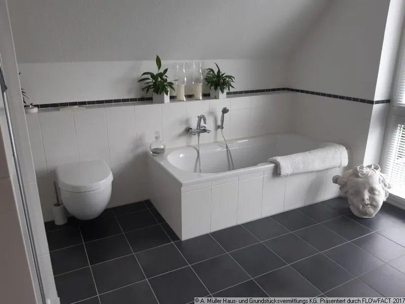 Nach Betreten des Objektes befindet man sich im geräumigen Hausflur, der mit einer anthrazitfarbenen Bodenfliese ausgelegt wurde. Auch im Gäste-WC und im Hauswirtschaftsraum ist dieser Fussboden durchgehend vorhanden.