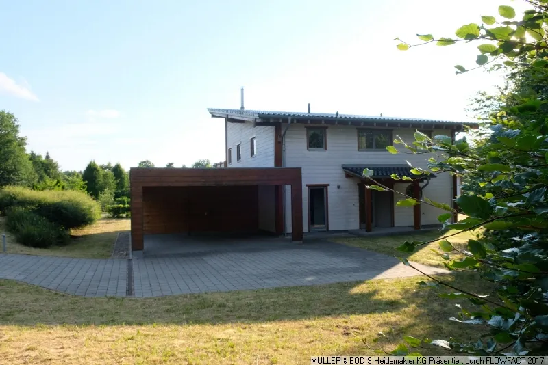 Die aktuelle Zuwegung zum Haus verläuft über eine gepflasterte Fahrbahn und führt direkt unter das große Carport, welches Unterstellmöglichkeiten für zwei Fahrzeuge bietet. An das Carport grenzt praktisch ein geräumiger Abstellraum für Fahrräder oder jeglichen Gartenbedarf. In diesem Raum und auch im Garten gibt es Aussenwasseranschlüsse.