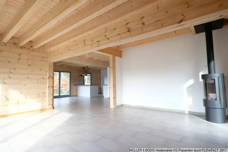 Ein gemütlicher Kaminofen im Wohnbereich sorgt für Wärme in den kalten Wintermonaten. Hier im Wohnbereich sind überall an der Decke die hölzernen Sichtbalken zu sehen, was dem Raum eine besondere Atmosphäre verleiht.