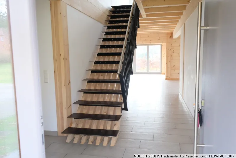 Ins Obergeschoss des Hauses gelangen Sie über eine stylische Treppe in Holzoptik mit einem modernen Metallgeländer. Auch in diesem Geschoss zieht sich die Optik des Sichtbalkenwerkes durch die Räume.