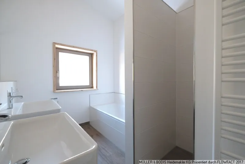 Vom Flur aus auf der rechten Seite finden Sie die beiden Kinderzimmer sowie ein weiteres Bad für die Kinder vor. Dieses ist ebenfalls mit zwei Waschbecken, einer ebenerdigen Dusche sowie einer Wanne ausgestattet und verfügt zusätzlich über einen Heizkörper-Trockner für Handtücher.
