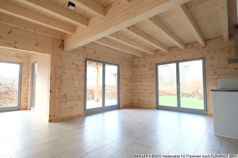 Die bodentiefen Fenster, weißen Innentüren und die offene Raumgestaltung lassen dieses Haus hell und einladend wirken. Der Fußboden ist farblich wunderschön in einem Grauton abgesetzt und harmoniert im Gesamteindruck.