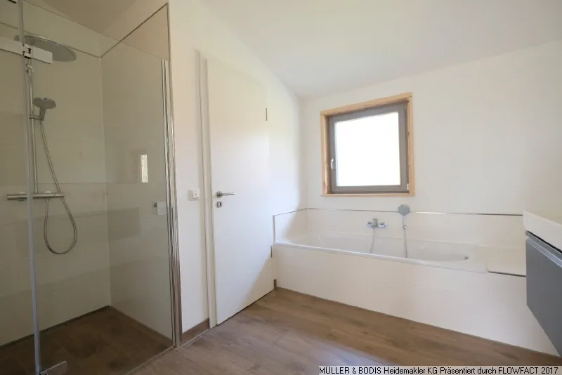 Im Obergeschoss finden Sie auf der linken Seite das Elternschlafzimmer mit angrenzenden Ankleidezimmer und einem direkten Zugang zum Elternbad. Es ist mit einer ebenerdigen Dusche mit zwei Duschköpfen, einer Badewanne, zwei Waschbecken, einem abgetrennten WC sowie einem großen Spiegel ausgestattet.