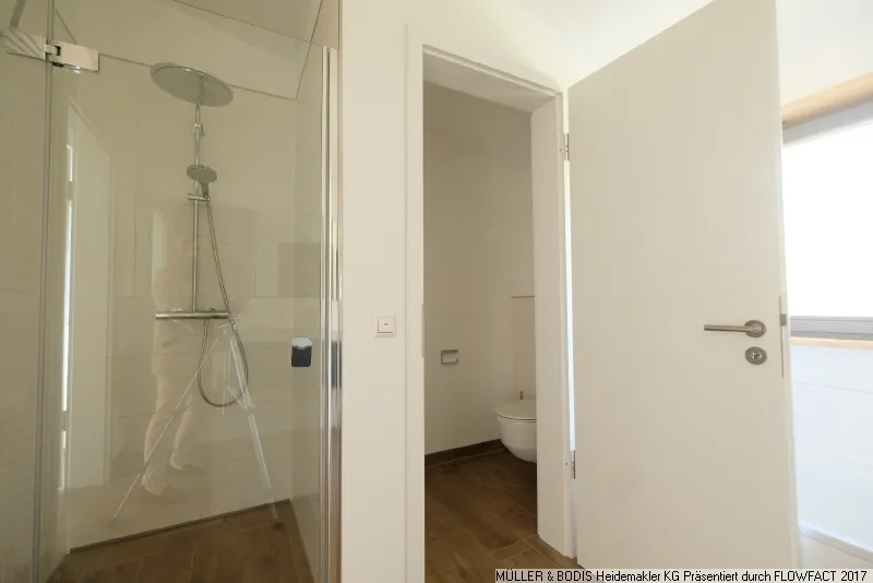 Vom Eingangsbereich aus erreichen Sie das Gästebad. Dieses verfügt über hochwertige Armaturen, eine bodentiefe Dusche mit zwei Duschköpfen, einen großen Spiegel und ein Handwaschbecken. Ein Rundfenster spiegelt den behaglichen Stil des Hauses wieder und sorgt für einen ganz besonderen Charme.