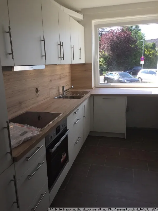 Die schicke moderne Einbauküche ist mit schlicht weißen Fronten ausgestattet. Der E-Herd verfügt über ein Ceranfeld und eine Dunstabzugshaube. Weiterhin sind eine Edelstahlspüle und ein Kühlschrank eingebaut. Hier besteht die Möglichkeit, eine Waschmaschine unter der Arbeitsplatte anzuschließen. Die Küche bietet Platz für eine Sitzgelegenheit für zwei Personen.