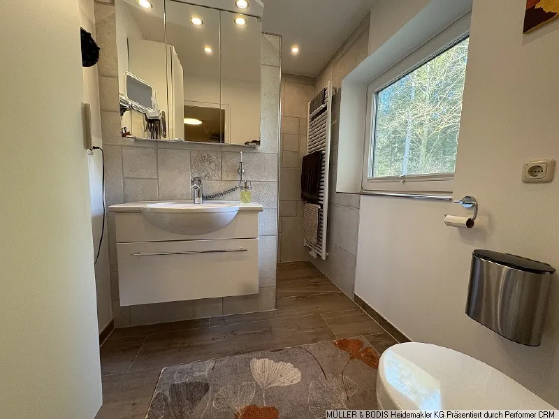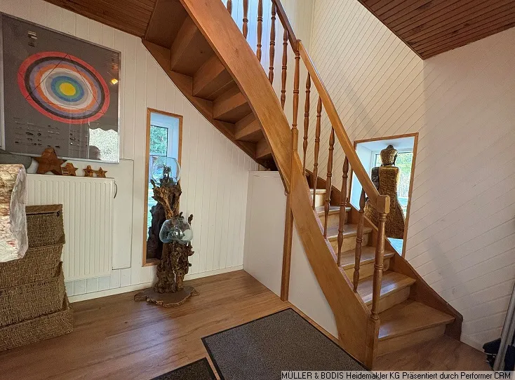 Nach Betreten der Haustür befinden Sie sich im großzügigen Hausflur. Von hier aus erreichen Sie das Erd- und das Obergeschoss. Im Erdgeschoss finden Sie zwei Schlafzimmer, das gemütliche Wohnzimmer, die Küche und das schicke neue Duschbad vor. Die Fußböden sind hier entweder mit einem Dielenfußboden oder mit Solnhofener Platten ausgelegt.
